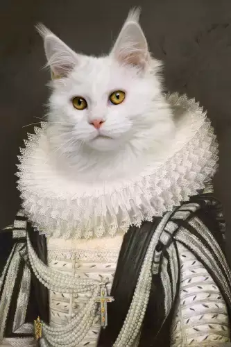 Koninklijke kat in het wit, vorstelijk gekleed met cape en gesteven wit geplooide kraag. Toch enig als je huisdieren hebt die hieraan voldoen en dan zo'n prachtig object aan je muur hangen. Wordt incl.ophangsysteem en gratis verzending ,goed verpakt geleverd. (04)