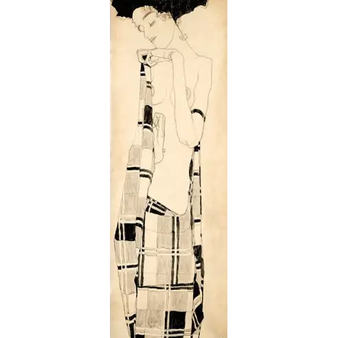 Staande vrouw, genaamd Gerdi Schiele geschilderd in de zo kenmerkende stijl van deze schilder. De vrouw gehuld in een plaid. Te bestellen op luminium incl. ophangsysteem.