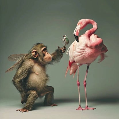Is dit niet schattig, vrolijk schilderij bij je aan de muur van aap en flamingo, uitgevoerd als decopanel in velvet.