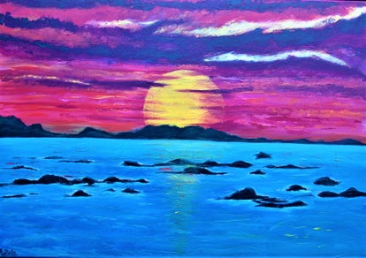 Seascape with sundown. Rocks in the foreground, painted with acrylic on cotton and finished with varnish. Listed and ready to hang.